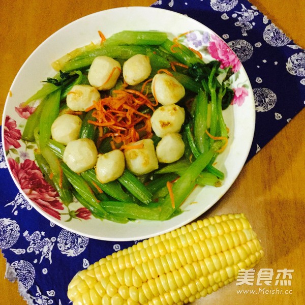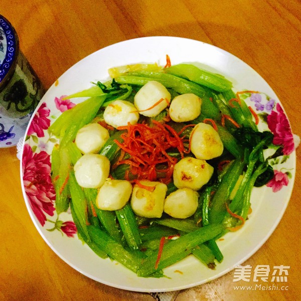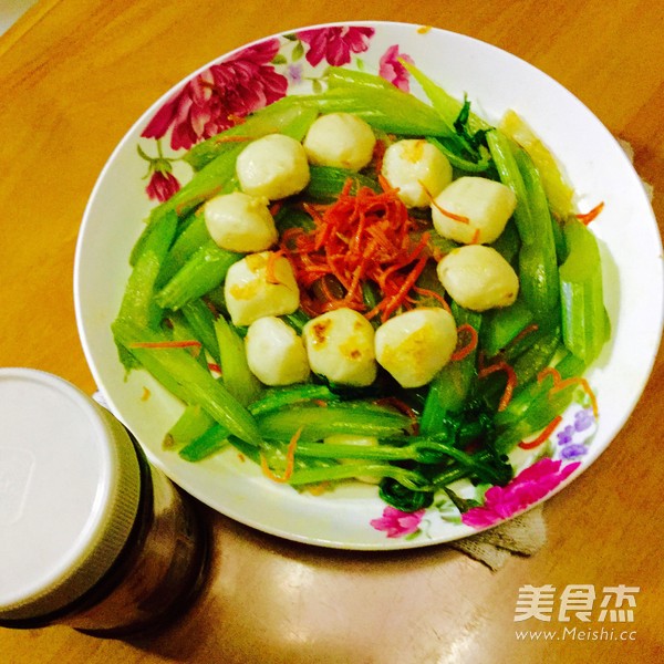 宝贝喜欢吃鱼丸 主料 西芹400克 鱼丸150克 胡萝卜50克 辅料 油适量 盐适量 蚝油少许 西芹炒鱼丸的做法 1.准备好材料,西芹斜切段,胡萝卜刨丝 2.起油锅 3.放入鱼丸炒 4.加入胡萝卜丝 5.加入西芹(西芹先烧开水,焯熟) 6.加入盐和蚝油,炒至熟 烹饪技巧 西芹比较慢熟,所以先焯熟再炒。