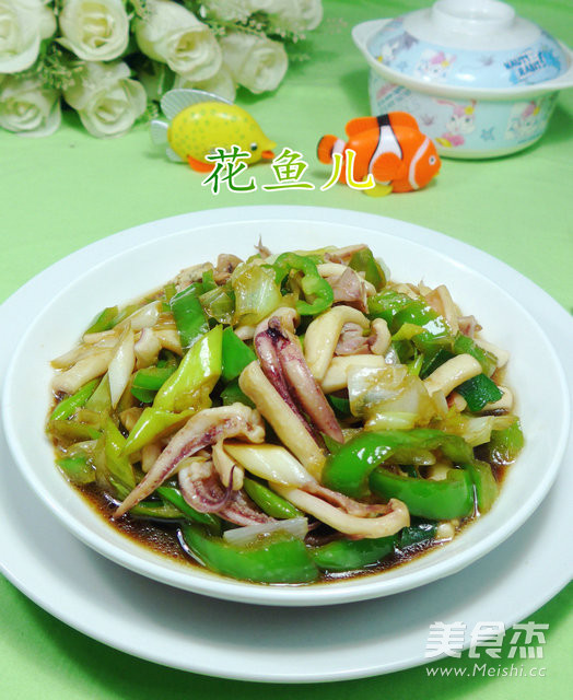 1.食材:鱿鱼(已洗净)、尖椒(已清洗切开)、大葱(已清洗切开)