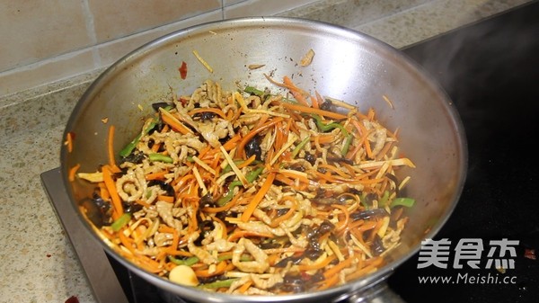 11.放入料汁,炒至料汁浓稠均匀的裹在各种丝上面。就可以了。