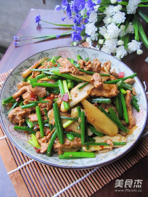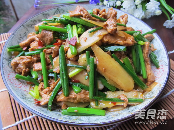 1.准备食材:韭菜苔、子姜、猪肉(切片,瘦肉放少水许淀粉抓匀)