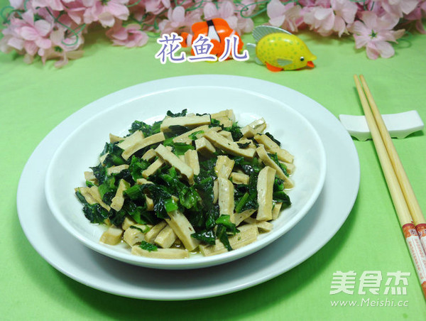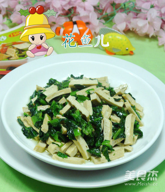 豆腐干营养丰富,含有大量蛋白质、脂肪、碳水化合物,还含有钙、磷、铁等多种人体所需的矿物质。。。 主料 豆腐干95克 莴笋叶65克 辅料 油3汤勺 盐0.5勺 味精0.5勺 莴笋叶炒豆腐干的做法 1.食材:豆腐干、莴笋叶(已清洗) 2.将豆腐干放在案板上切开,待用 3.将已清洗好的莴笋叶放在案板上切碎,待用 4.接着,将切好的豆腐干下入清水锅中焯开,捞出 5.在锅中加入3汤勺油烧热,下入切好的莴笋叶和焯好的豆腐干翻炒翻炒 6. 然后,加0.5勺盐 7.加0.5勺味精 8.调味炒匀,即成