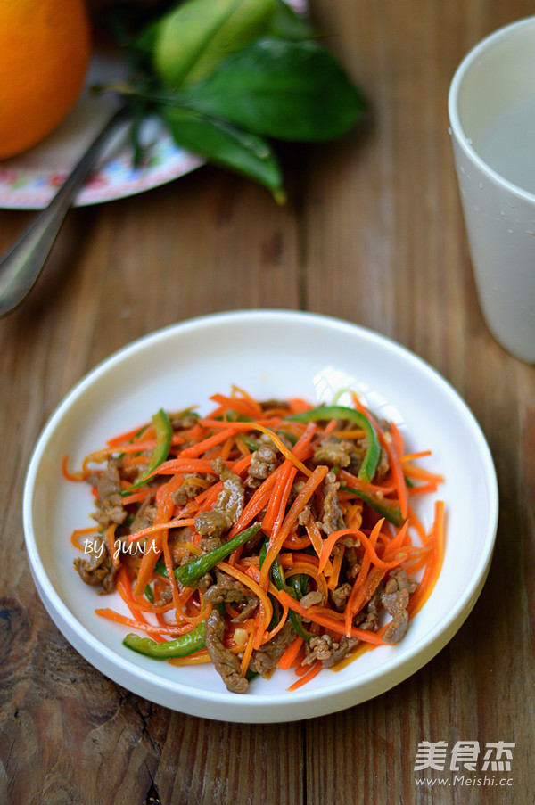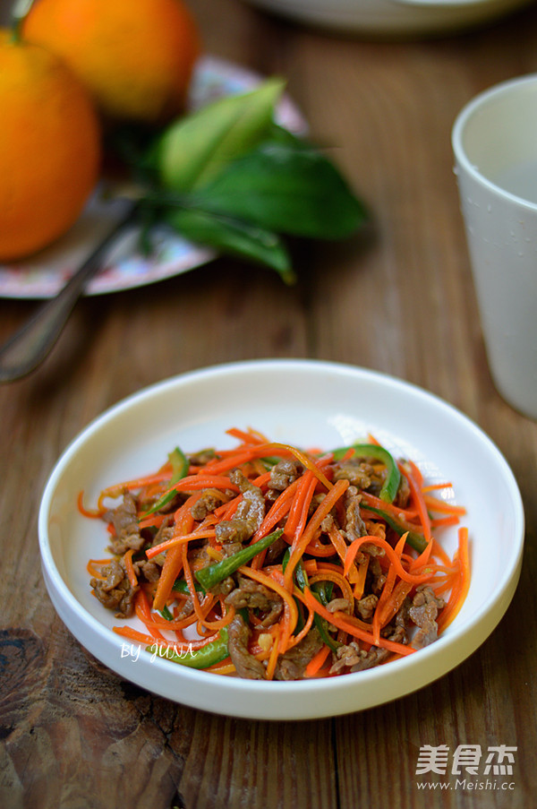 简单的小炒,家常美味~ 主料 牛肉200g 胡萝卜1个 青椒1个 蒜2瓣 姜5g 辅料 生抽1汤匙 料酒1茶匙 白糖1/4茶匙 淀粉1茶匙 盐少许 小炒牛肉丝的做法 1.牛肉逆着条纹切丝,用生抽、料酒、白糖、生粉拌匀后腌制15-20分钟 2.胡萝卜、青椒切丝,姜蒜切沫 3.锅里烧热油,爆香姜蒜沫 4.锅里烧热油,爆香姜蒜沫 5.放入胡萝卜和青椒丝拌炒 6. 炒至断生后放入腌制好的牛肉丝 7.大火翻炒至牛肉变色即可,出锅前调入少许盐调味 烹饪技巧 牛肉炒久后口感会偏硬,不滑嫩了,大火滑炒至变色即可