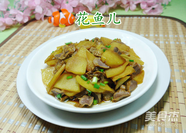 4.在锅中加入3汤勺油烧热,下入焯好的土豆和切好的熟鸡胗翻炒翻炒