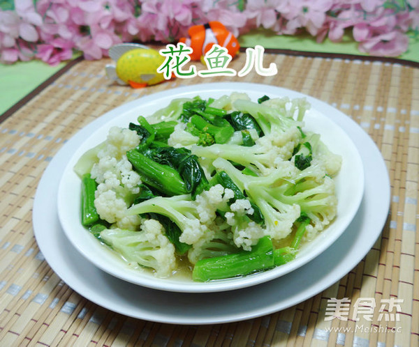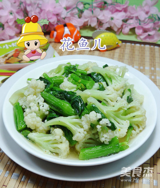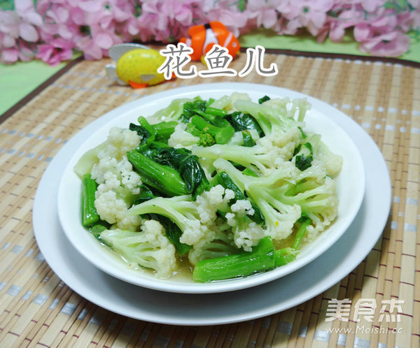 3.在锅中加入3汤勺油烧热,下入花菜翻炒翻炒
