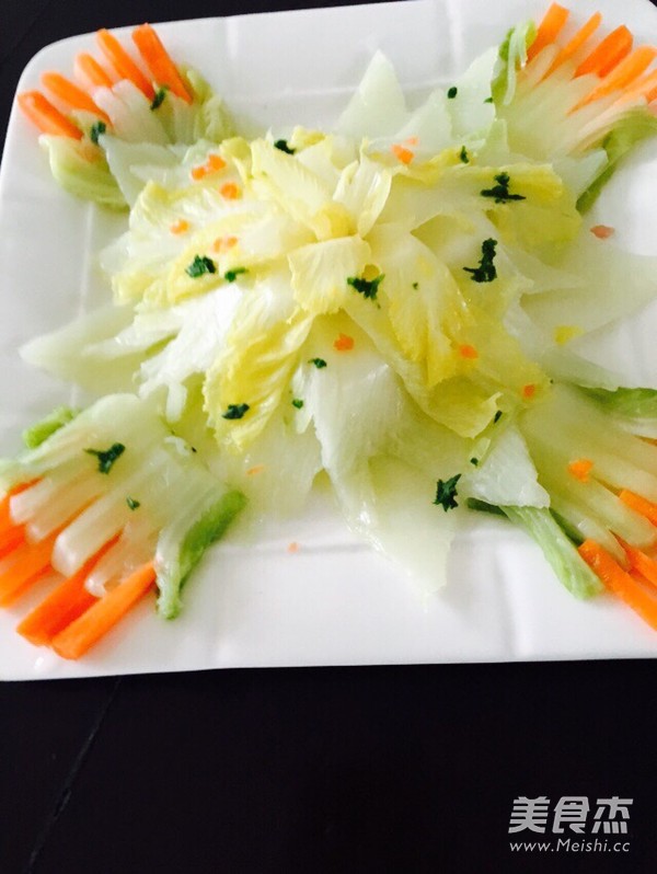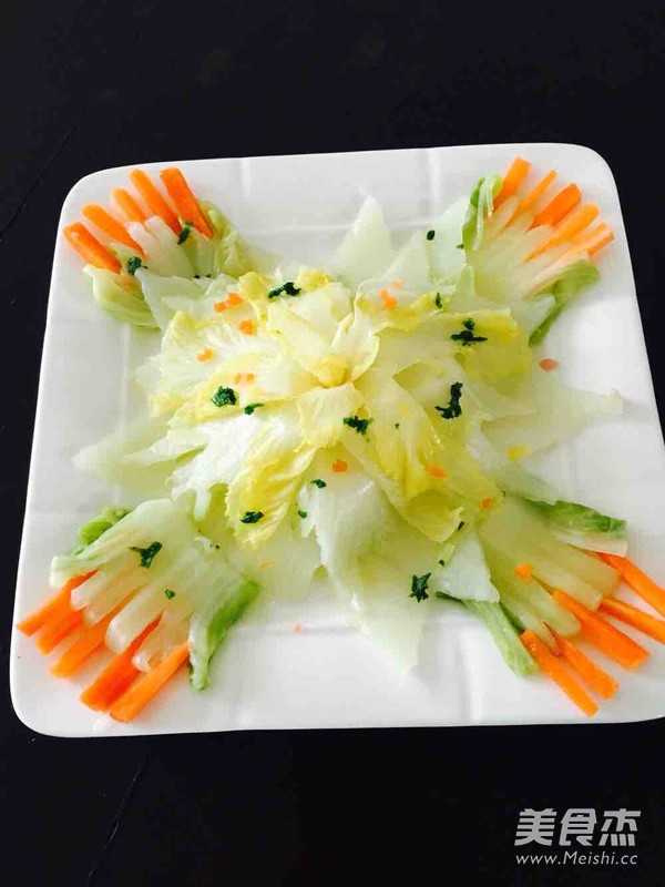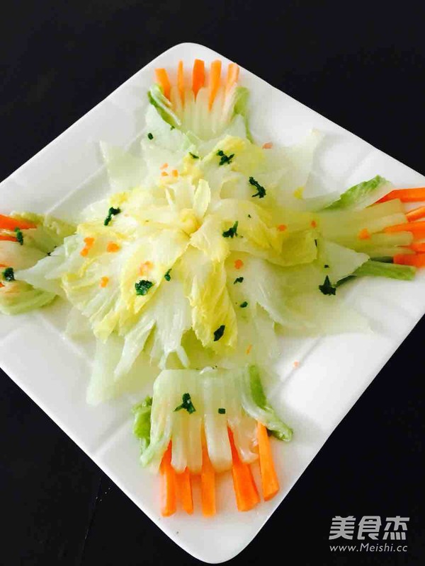 佛手观音莲,寓意平安吉祥 主料 大白菜1颗 胡萝卜1根 白菜帮4片 辅料 萝卜碎适量 葱末适量 盐1小勺 高汤1汤勺 佛手观音莲的做法 1.大白菜对半切开 2.用叉子从根部,从外到内依次刻成莲花状 3.电饭煲放入开水,将莲花放入加点盐煮软 4.同时将白菜梗也放入一起煮软 5.胡萝卜切成小段 6.煮好的白菜梗三折,再用刀划五下,再将胡萝卜段放入做成佛手 7.把四个佛手放在四个角,莲花放在中间,再撒上葱末和胡萝卜碎,加入一汤匙高汤,入锅蒸3分钟即可!