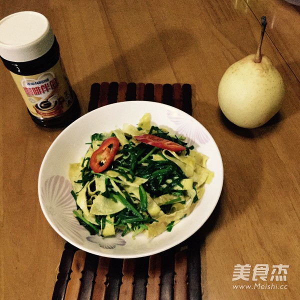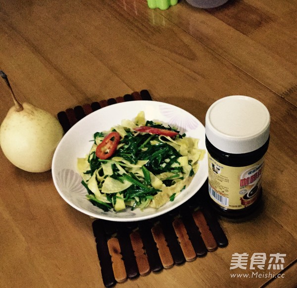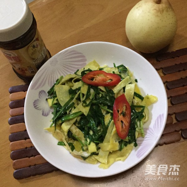不想吃肉肉,吃个鸡蛋不错 主料 鸡蛋100克 韭菜100克 菜椒10克 辅料 油10克 盐3克 韭菜炒蛋丝的做法 1.准备好材料 2.鸡蛋打入碗里,韭菜切段 3.鸡蛋打散,加入少许盐 4.电热锅放入油 5.鸡蛋用电热锅煎好,薄薄的 6.切成粗丝盛起 7.就让韭菜翻炒至断生,盛起便可享用了,再倒入蛋丝,加入盐同炒均匀便可上菜了 烹饪技巧 韭菜炒至断生就好了