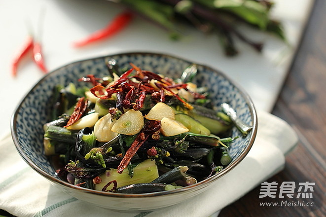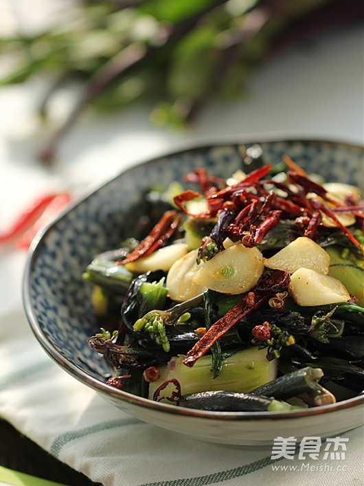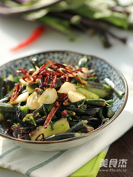 红菜苔的最有名的做法是红菜薹炒腊肉,最家常的做法是清炒菜薹, 而我今天却做个不一样的“炝拌红菜薹”。 红菜薹尖摘成段,粗茎去除筋膜,中间切开, 准备好的红菜薹焯水,再将油加热, 炝一下红菜薹最后拌好。“ 炝拌红菜薹”, 鲜亮的色泽、脆嫩的口感、鲜香的口味,能吃到经霜打过后红菜薹清冽甘甜的滋味,让你欲罢不能,是家庭餐桌中不可替代的冷盘菜肴。