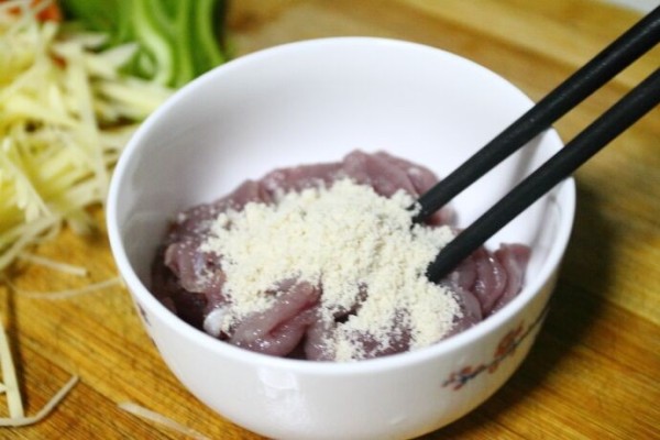 2、里脊肉切小片,加入鸡粉拌匀调味