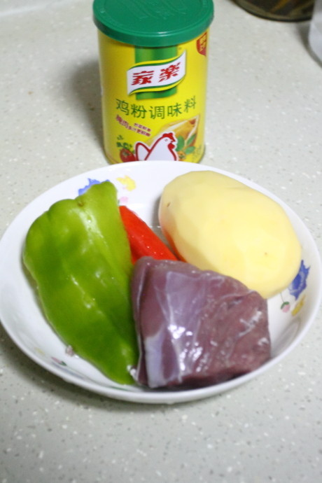 土豆1个、红椒半个、青椒半个、猪里脊2两、鸡粉2小勺、盐少许、食用油适量