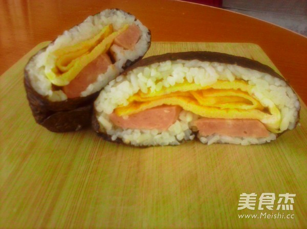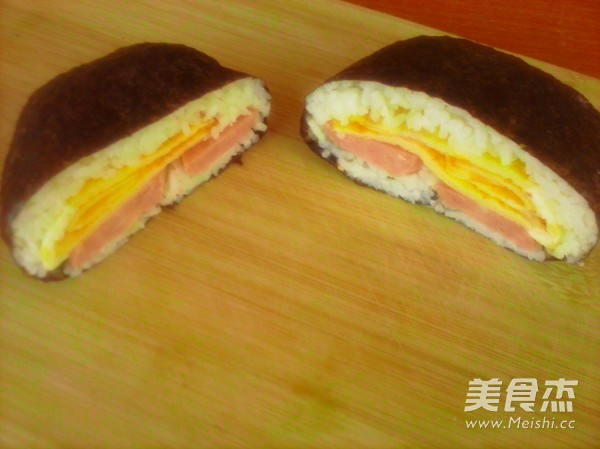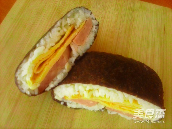 4.紫菜片上铺上米饭,米饭铺成大约的菱形,角与紫菜的边相对,上面放上煎好的鸡蛋