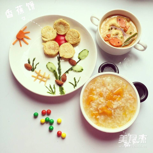阳光灿烂的一个早晨,吃上一盘元气满满的大拼盘,有太阳有花草昆虫,当然会有一个好心情啦! 主料 普通面粉1汤匙 香蕉1个 鸡蛋1个 辅料 小番茄1个 杏仁适量 黄瓜适量 胡萝卜适量 元气早餐的做法 1.把香蕉剥皮切成小丁 2.鸡蛋打入碗中加入面粉然后倒入香蕉丁搅拌均匀成可以流动的饼糊糊 3.平底锅少油舀入香蕉饼糊,小火煎制两面金黄 4.煎好后装入盘中(饼煎的不好看没有关系,可以后期用烹饪剪刀修饰一下形状) 5.发挥自己想象制作出脑洞大开的早餐look! 烹饪技巧 任意发挥自己的想象,喜欢什么拼什么,拼出一个好心情!