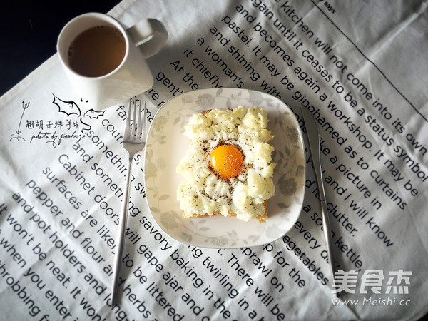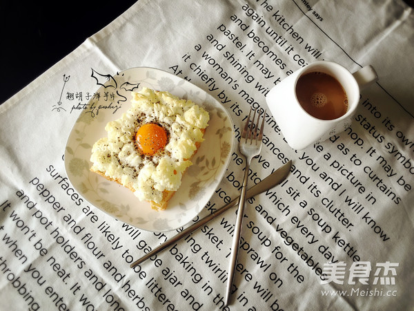 4.将打发好的蛋清用勺子随意的铺在吐司上,铺完后用勺背在中间压出一个“窝”将蛋黄放进去 烤箱预热