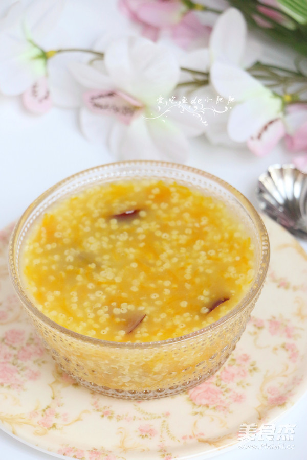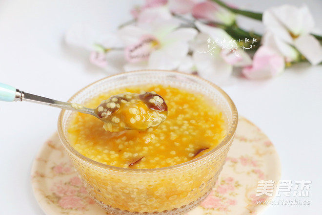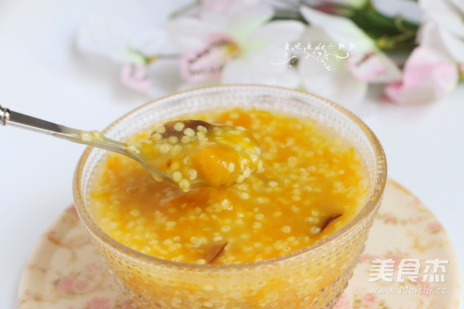 12.盖好锅盖,继续煮至南瓜熟烂,小米绵稠时即可关火,吃的时候可再试下味,不够甜再放点糖调味