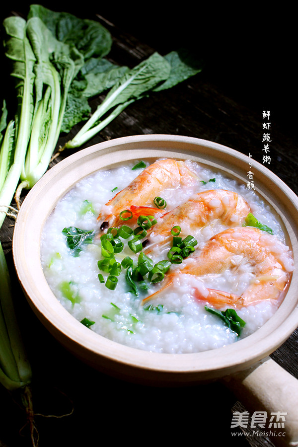 5.把虾,姜丝放入粥里,开着锅盖继续熬煮10分钟。 如果你的压力锅没有开盖熬煮的功能,那就把以上食材放入锅后盖盖继续五分钟,至时间到压力锅自行散气开盖即可。 到点后关闭电源,放入小白菜和小葱,酌情加盐和白胡椒粉调味,我加了两小勺盐和1/2小勺白胡椒粉,搅匀即可。