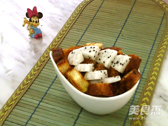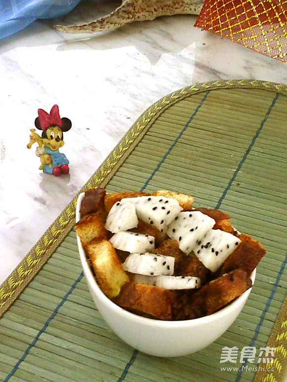搜了半天,也没看见一道关于水果的面包布丁,无论是烤的还是蒸的。那就自己加点儿水果。水果太多,挨个儿想了一遍,换了若干种,按照不耐存放度,最后发现,必须立即马上解决掉的是那桌上的半个火龙果。没得选,火龙果面包布丁,蒸的,比较省事儿,省时。最重要的是,不费电。