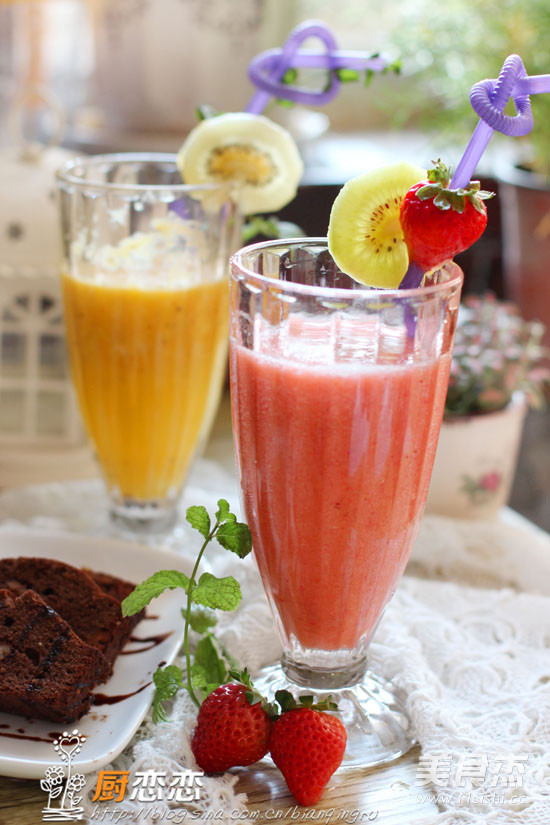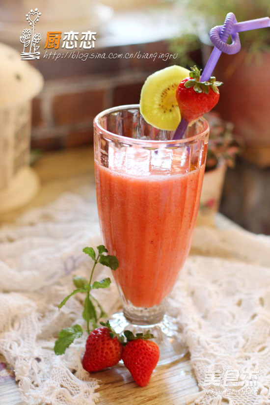 超市买的促销金果味道酸酸的一点不好吃,配着草莓打成果汁倒是很不错的搭配。而且,冬天室内室外都十分的干燥,多喝点开水、果汁等,对于健康也是很有好处哒。作为下午茶也是很不错的哦 主料 猕猴桃1个 草莓10颗 辅料 盐适量 白糖10g 白开水30毫升 金果草莓汁的做法 1.草莓用盐水泡洗干净,然后摘去草莓蒂 2.金果削皮后切成块 3.把金果、草莓、白糖和开水倒进料理机 4.启动料理机大约2分钟的样子,打到果肉细碎成糊状即可 烹饪技巧 我喜欢在料理机里多打会儿,这样果汁更细滑些。