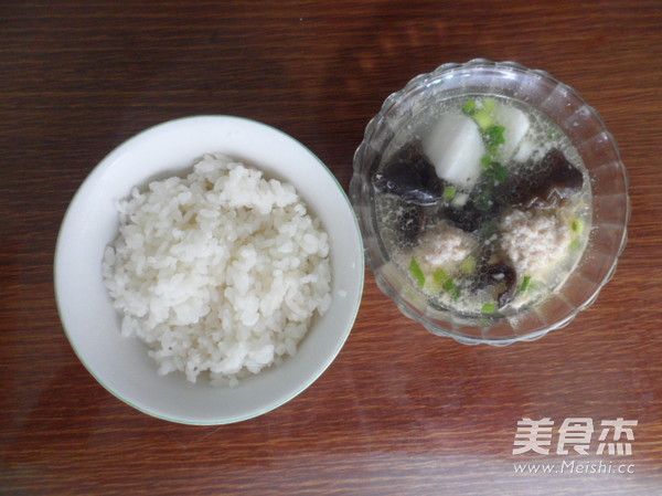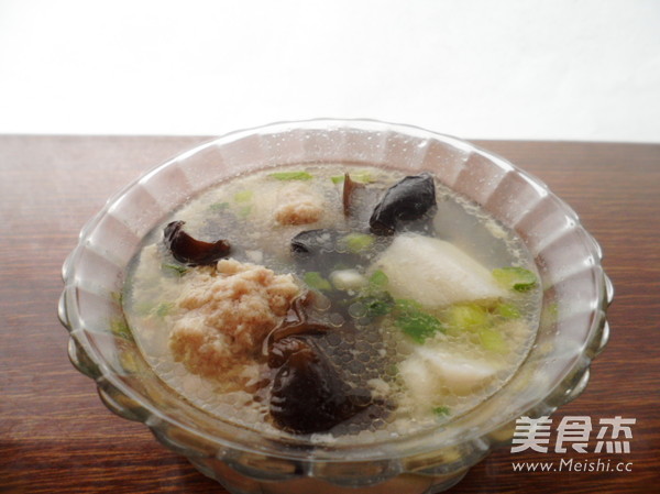 5.戴上一次性手套,把肉末放在手心,从虎口挤出在锅中,就成一个圆球,中火煮8分钟。再加入准备好的木耳和山药,煮4分钟即可。