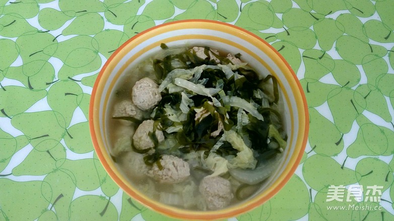春天正是海带大量上市时,海带营养丰富,老少皆宜。 主料 肉馅200克 白菜1棵 海带200克 辅料 蚝油1小勺 精盐少许 酱油少许 白糖少许 料酒1小勺 白胡椒少许 葱白少许 鸡精少许 白菜海带丸子汤的做法 1.猪肉切片剁碎 2.放入料酒.蚝油.姜末 3.拌均加入盐.糖.胡椒粉顺一个方向搅拌,添少许水继续搅拌,最后添玉米淀粉。 4.葱末放上边,等下锅时加少许香油搅拌 5.海带事先煮好 6.改刀白菜.海带切丝 7.炒勺放油.虾皮小火煸炒放葱花炒出香味放蚝油和白菜,大火炒出水分盛出备用。 8.锅中放入开水,取一个小勺,用虎口挤入丸子放入锅中。 9.丸子漂浮上来,下海带丝。 10.煮两分钟下白菜丝,炖的时间自行掌握。