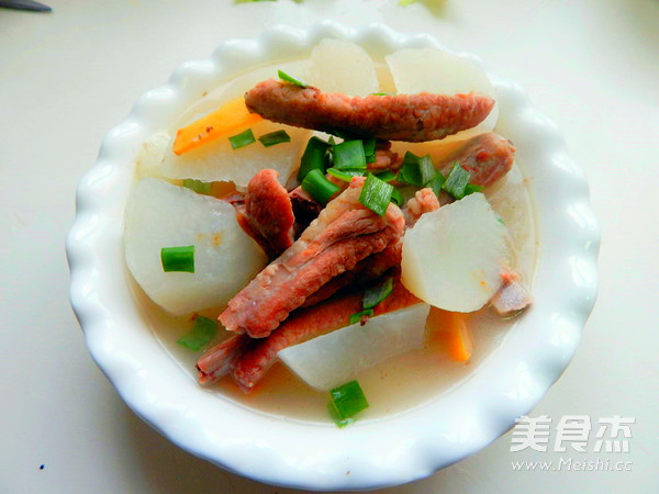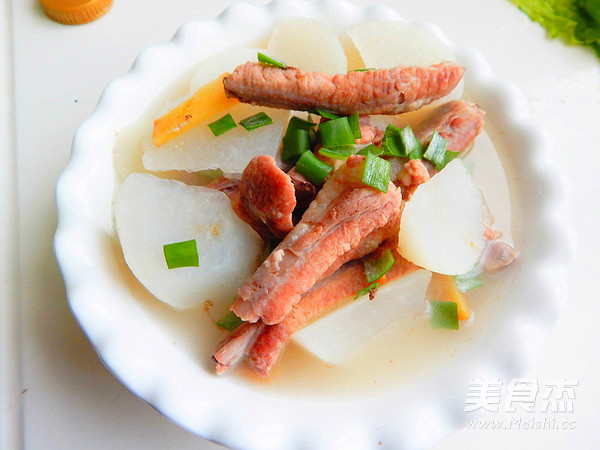 家里来客人,想炖个汤来不急了,只能用高压锅做了 主料 肋排500克 白萝卜200克 辅料 料酒5克 盐7克 水3碗 白萝卜肋排汤的做法 1.肋排放清水里 2.加入料酒 3.煮一会 4.然后清洗干净加入高压锅里 5.加入葱姜片 6.加入3大碗水 7.高压锅排骨功能压35分钟 8.这是压好的排骨,倒入锅里 9.白萝卜去皮 10.切刀块 11.加入锅里炖 12.炖30分钟加入盐在炖30分钟 13.这是炖好的鲜汤 烹饪技巧 如果来的急的话用炖锅炖是相当的美味