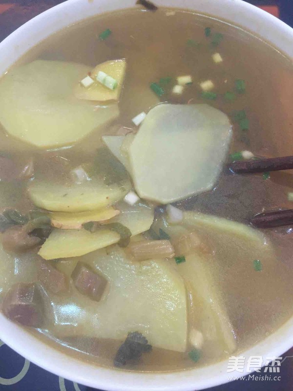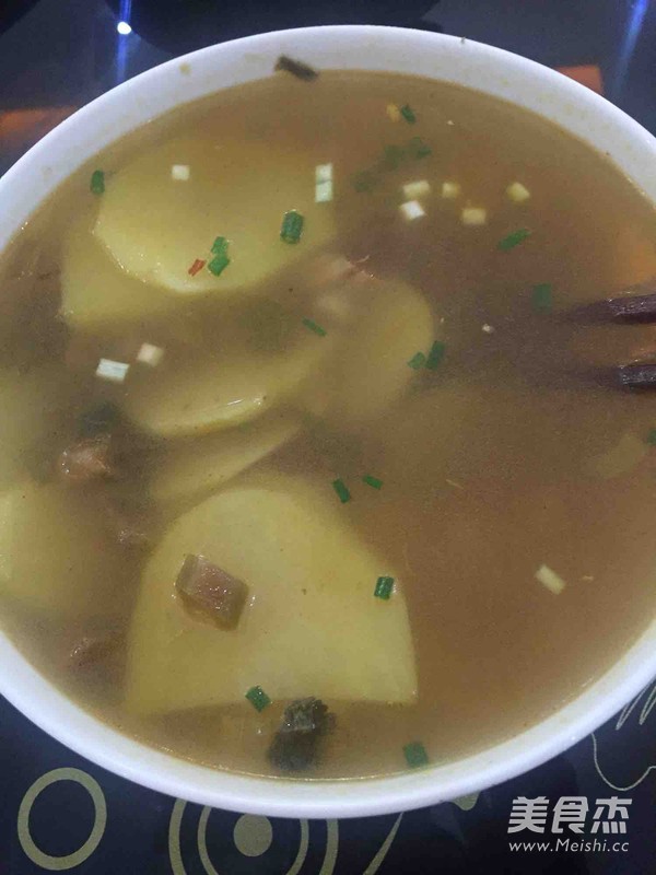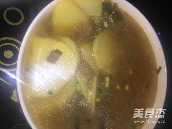 酸辣有味… 主料 土豆2个 酸菜半碗 辅料 姜片5片 大葱1根 猪油1勺 酸菜土豆汤的做法 1.酸菜要酸 2.把水煮开 3.放一勺猪油 4.煮煮煮 5.煮一分钟放土豆 6.土豆要煮软 7.放点小葱 烹饪技巧 很简单的汤菜