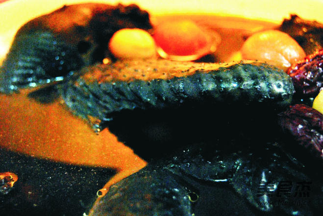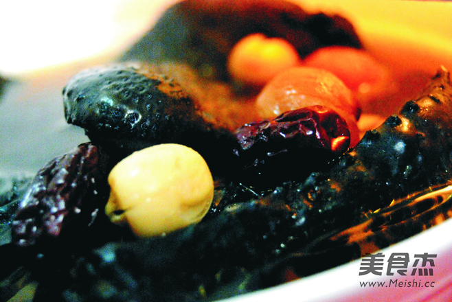 3.然后将泡发好的黑豆.洗干净的何首乌红枣.莲子.枸杞.桂圆和乌鸡一起放入电饭煲中.加入一定量的开水.