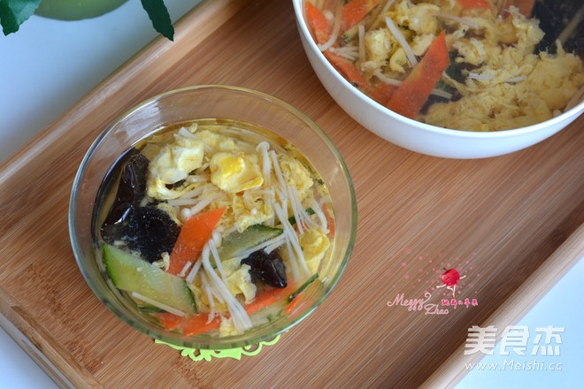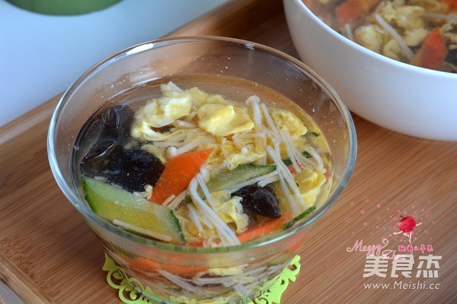 我家吃饭总喜欢喝点汤。其实也没有什么固定的搭配和套路,完全是随手取材。有时切几刀白菜叶子,再来半捆儿粉丝,做成白菜粉丝素汤;有时再来几根菠菜,打个鸡蛋,做个菠菜蛋花汤……真是有什么做什么了。今天的这道酸辣汤,用料很丰富。金针菇、黄瓜片、黑木耳、胡萝卜片,再抡个鸡蛋,这满锅的红黄绿黑白就全有了。在味道上,来点醋和白胡椒粉,这酸辣味儿就出来了。