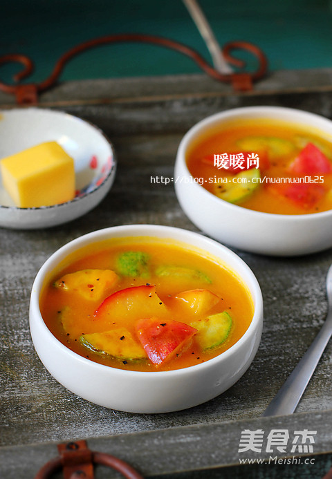 6.将煎好的西葫芦和花牛果放入碗中,淋上煮好的南瓜味噌汤,酌情撒一些黑胡椒碎即可食用。