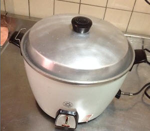 4、放入电锅中,外锅虽一杯水,盖上锅盖,按下电源,开始炖煮。