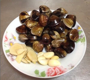 2、把蛤蜊清洗干净,沙完全吐光。参考:蛤蜊吐沙最快最干净的方法,然后把蒜头去皮,姜切片。