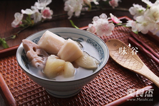 节后湿冷的感觉真是不舒服啊,这时候应该多吃一些津养阴滋润多汁的食品,中医认为白色食物多有滋阴润肺的功效,雪梨、莲藕、荸荠(马蹄)、山药都是润肺止咳的好食材,其中后三种根茎类的食材还有补足身体能量,加强免疫力,预防受寒感冒的功效,适合一家人饮用。 主料 莲藕300克 荸荠7粒 雪梨1个 淮山药150克 辅料 食盐适量 梨藕荸荠汤的做法 1.准备好所有材料。 2.将莲藕一大节和山药半根去皮切小块,雪梨切块,荸荠(马蹄)去皮。 3.将莲藕、山药和荸荠放入锅中,加适量的清水,大火烧开后转小火煮半小时后加入雪梨再煮10分钟。 4.出锅前加入适量食盐调味即可。