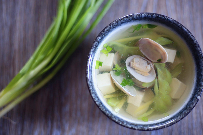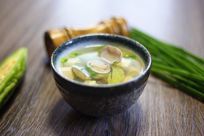 4.另用一个干净的锅,加入1升清水,煮沸后依次加入豆腐、苦瓜、花蛤,滚开后加入姜丝、食盐、味精,略煮一会儿,出锅后加入少许葱花(香葱),即可完成