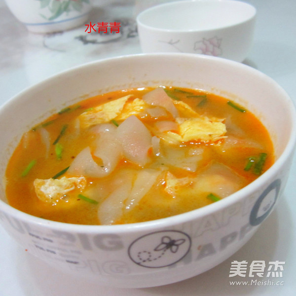 鸡蛋被认为是营养丰富的食品,含有蛋白质、脂肪、卵黄素、卵磷脂、维生素和铁、钙、钾等人体所需要的矿物质。吃的方法有许多种,可以作为主菜,也可以作为配菜,能搭配出许多的美味佳肴。 主料 鸡蛋1个 粉皮250克 辅料 盐小茶匙 调味鲜2克 油8克 胡椒粉5克 香葱1棵 鸡蛋粉皮汤的做法 1.刚做好的粉皮 2.备鸡蛋,香葱 3.蛋先煎成蛋皮 4.切块 5.锅里放清水或高汤 6.烧开 7.再放进粉皮和蛋皮 8.放盐 9.再次烧开 10.最后撒上香葱,胡椒粉 11.即可 烹饪技巧 没有高汤放点肉末更好吃