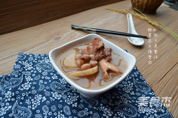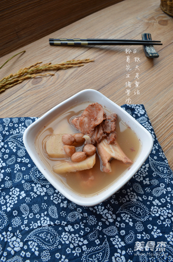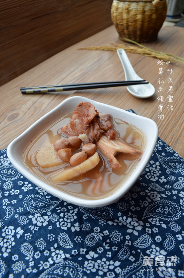 孩子身体长得瘦小,饭量不大,每天都给他煲汤补充营养 主料 猪骨250克 粉葛300克 花生仁(生)150克 辅料 盐4克 陈皮1块 粉葛花生猪骨汤的做法 1.花生、陈皮洗净提前浸泡2小时 2.猪骨鱼冷水同时落锅 3.不盖盖烧煮出浮末后,捞出猪骨 4.汤锅倒入去皮切小块的粉葛 5.加入泡好的花生 6.倒入猪骨 7.加入约2升的开水 8.盖盖大火烧开转中小火煲约2小时 9.最后下盐盖盖,小火再煲5分钟,即可 烹饪技巧 猪骨出下水再煲汤,做出的汤没有醒味;花生先泡发一下易煲软烂,陈皮泡一泡去苦涩味