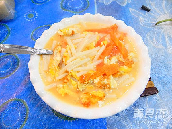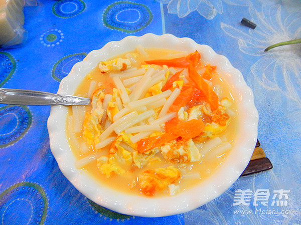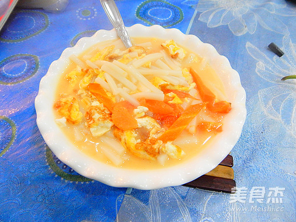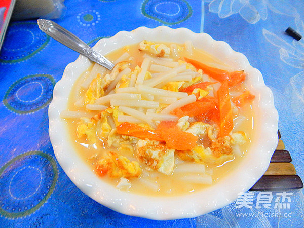 我们家很喜欢吃年糕,我会时不时的煮点, 主料 年糕300克 西红柿2个 鸡蛋2个 辅料 盐5克 水2碗 鸡精3克 西红柿鸡蛋年糕汤的做法 1.年糕清洗干净 2.切成小段 3.西红柿切片 4.锅里加入油 5.倒入鸡蛋液 6.炒熟悉装盘 7.然后在加入油加入西红柿炒 8.西红柿炒出汁 9.然后加入两碗水 10.大火煮五分钟加入年糕煮 11.然后在煮几分钟 12.煮至年糕软 13.加入炒好的鸡蛋 14.炒匀后在炖3分钟 15.出锅前加入鸡精炒匀 16.然后装盘 烹饪技巧 平时都炒年糕总感觉干,就来道汤,也非常的鲜美