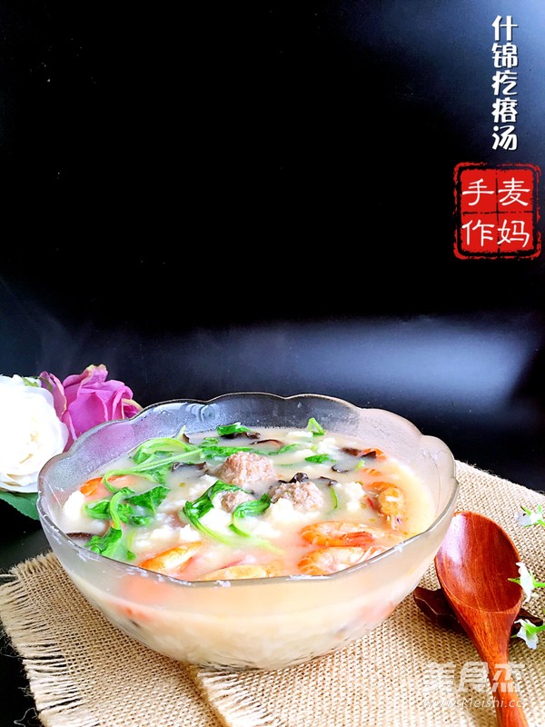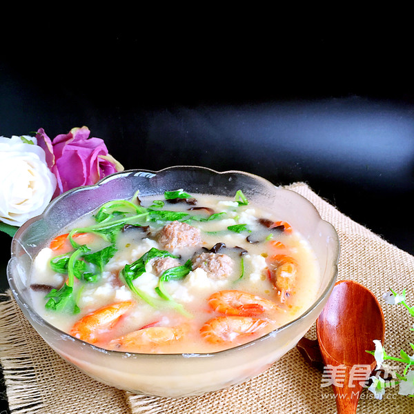 高粉150克 番茄1个 鸡蛋1个 香菇(干)4个 黑木耳5克 河虾150克 青菜100克 肉丸4个