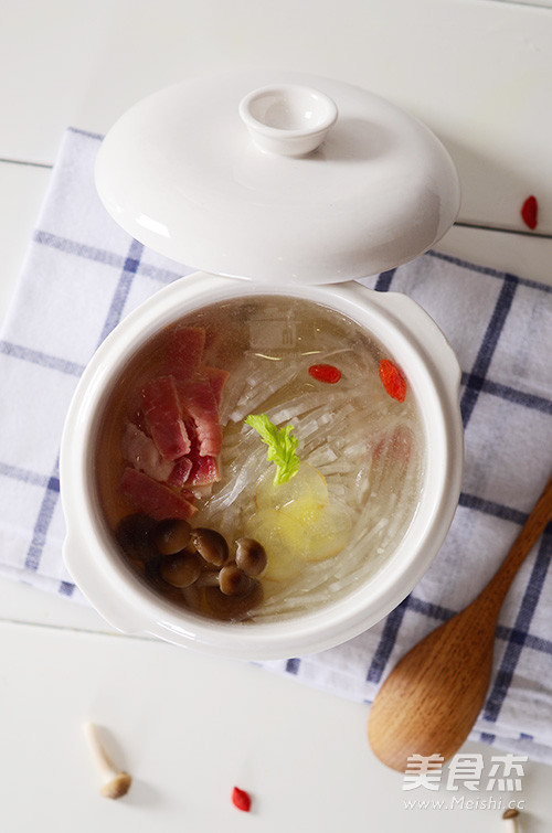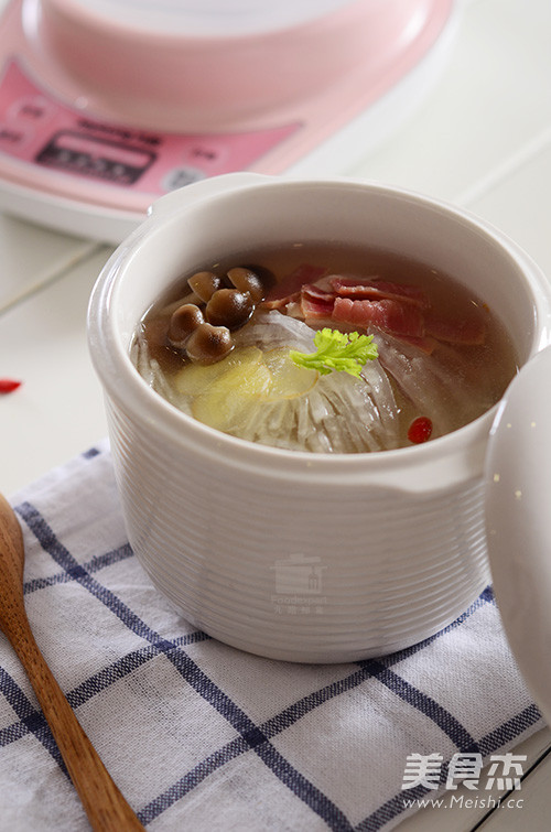 蟹味菇、火腿、白萝卜不煮进火锅也能美味的不像话生姜、枸杞一罐好汤怎能少的了 主料 蟹味菇80克 白萝卜120克 火腿50克 辅料 枸杞适量 生姜适量 萝卜菌菇汤的做法 1.准备食材:蟹味菇、火腿、白萝卜、生姜、枸杞 2.萝卜去皮切丝 3.火腿切薄片 4.所有食材加入九阳电炖锅(型号DGD0705BS),注入清水,选择炖汤功能 5.等待烹饪完成,让这碗汤温暖这个冬天吧