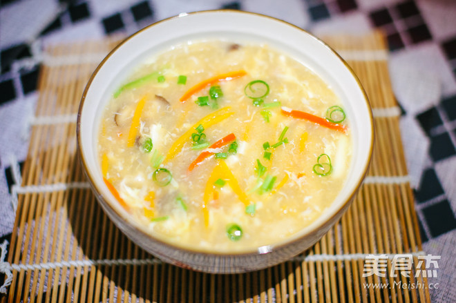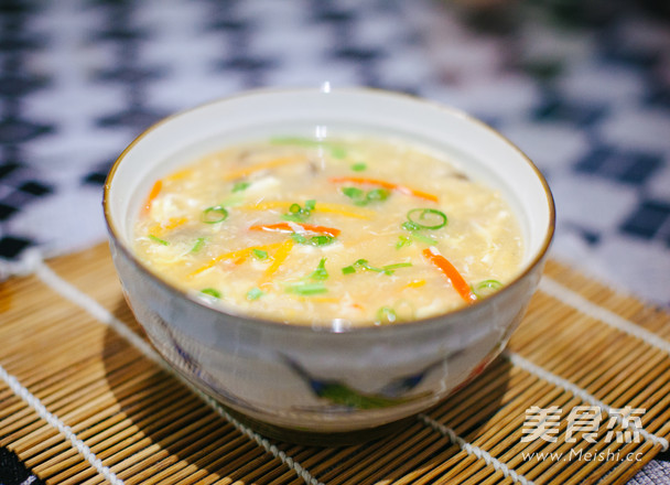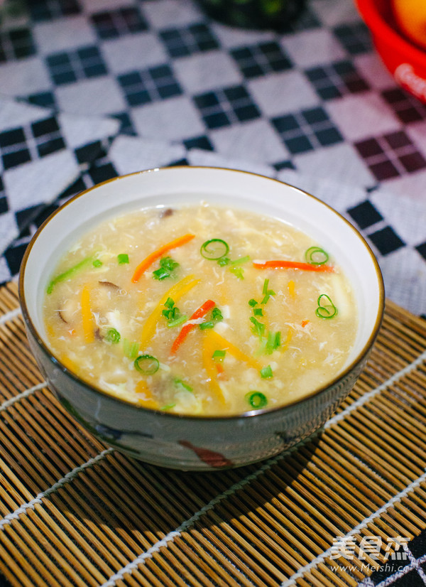 胡萝卜30克 鸡蛋1个 红椒1颗 水或者高汤700毫升 陈醋2大匙 白砂糖1小匙 芝麻香油1小匙 胡椒粉1/2小匙 淀粉1大匙