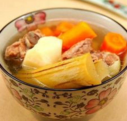 4、煮沸清水,放入所有材料,大火煮20分钟,转小火煲一个半小时,即可饮用(茅根、竹蔗可咀嚼吸汁,其他汤渣可食用)。