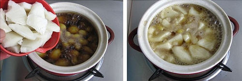 5、汤锅中加入适量水,放入白果和古方红糖。
