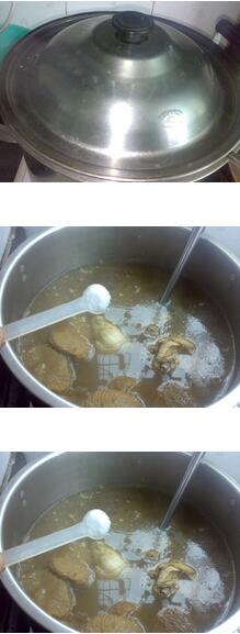 猴头菇鸡汤的材料:猴头菇,冬菇,鸡,猪骨,姜片猴头菇鸡汤的做法:1.猴头菇、冬菇需提前泡透,鸡、猪骨砍大块 2.把洗好的材料放进汤煲内,加入适量的水,大火煮沸后,转小火,煲2小时左右,把汤煲至汤色浓浓的,加入适量的盐,再煮沸一会,就可以装碗了