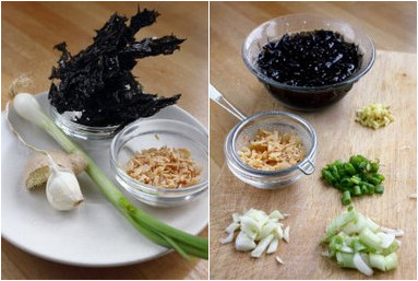 2、然后把紫菜和虾皮冲洗干净;葱姜蒜切好备用。(注意虾皮要多洗几道,需要焯一下水,能清除多余的致癌物质)