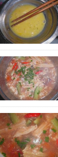 酸辣鱿鱼汤的材料:小鱿鱼5只,腐竹3根,黄瓜半根,西红柿1个,鸡蛋1个,油,盐,生姜、葱、干辣椒,地瓜粉
