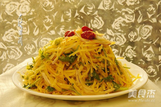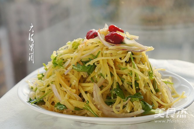 吃不够的家常菜,微辣,爽口下饭,自家餐桌不倒的招牌菜。 主料 土豆2个 辅料 油半汤匙 盐适量 毛葱1个 花椒1克 香菜适量 干红椒适量 大蒜适量 炝拌土豆丝的做法 1.备齐材料 2.毛葱切丝、香菜切碎 3.蒜切碎 4.土豆去皮洗净擦丝,冷水浸泡15分钟,泡出淀粉 5.过水焯一下 6.捞出过冷水,控净水分 7.菜盆加入土豆丝、洋葱、香菜、蒜碎、盐、白糖 8.热油锅爆香花椒粒和干红椒 9.倒入菜盆拌匀 10.装盘,OK! 烹饪技巧 1、喜欢辣味的可以将干红椒撕碎油炸; 2、土豆丝泡出淀粉,吃起来才爽口。