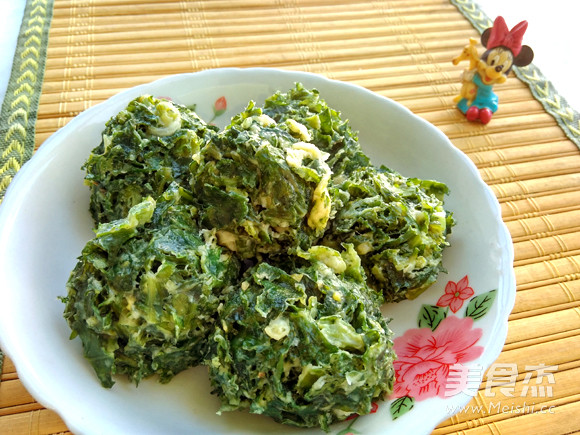于是,改变程序,做个不挤水的蒸茼蒿丸子。盐不再直接与茼蒿拌和,因为茼蒿加盐后就会被腌出水来,水汪汪的感觉不爽。先将蛋液与茼蒿混合,让茼蒿粘裹上蛋液,就好与粉黏合了。将盐同所有的粉混合在一起,筛入茼蒿,这样会拌得更均匀,也不容易起粉团。纠结了1秒还是保留了原方的泡打粉,因为它可以让口感蓬松。