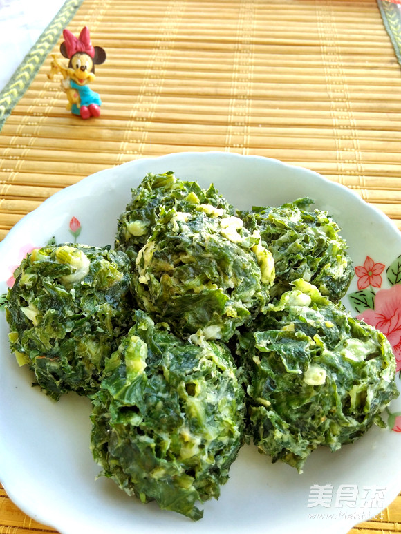 不管三七二十一,决定改炸为蒸,理论上应该可行。临到动手又楞了,怎么还要挤水啊?先用盐将茼蒿杀出水来挤掉,再拌和面粉做成丸子。不想挤水,嫌麻烦,而且,营养专家也说过,菜汁儿里有营养。