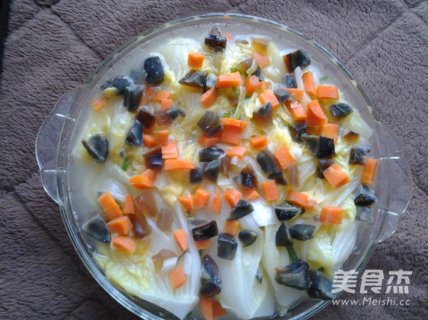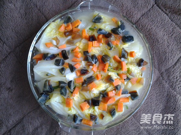 家里正好有吃剩下的白菜心,今天就用做上汤娃娃菜的做法,把白菜干掉。 主料 白菜1颗 皮蛋2个 胡萝卜半根 辅料 玉米油2勺 盐1勺 葱2根 蒜3个 上汤白菜的做法 1.白菜心一切六,洗净 2.皮蛋切丁,胡萝卜切丁,葱切段,蒜切丁 3.热油锅,放入葱,蒜爆香,加入一碗清水煮开,加入白菜煮(如果有排骨汤更好) 4.煮熟,加盐调味 5.捞出 6.加入皮蛋和胡萝卜煮开 7.煮开后捞出 烹饪技巧 无