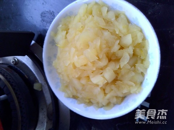7.变得更软,苹果中的水份开始游离出来,盖锅继续熬。 水份减少,取一勺子,划散一下,苹果即成为小的颗粒,但还有个别的有点硬,盖锅继续熬。