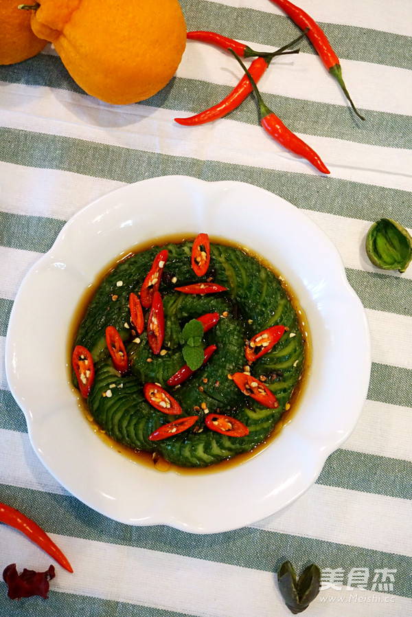 7.根据您的喜好做一碗酸甜调味汁,喜好辣口的可以放些辣椒油。您着急的话,腌制半小时后就可以浇汁食用,不过蓑衣黄瓜要好吃,还是腌制时间长一点,入冰箱4-5小时,黄瓜片析出水分,充分吸收调味料,才特别好吃。
