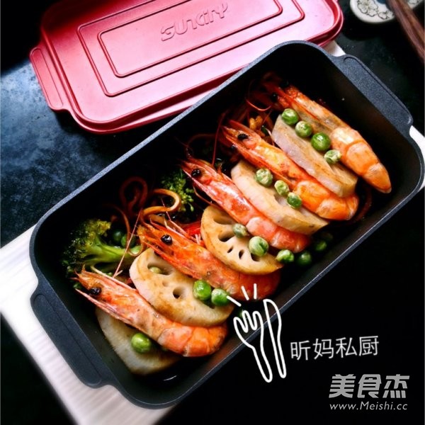 用吐司盒焗一份营养便当,搭配丰富一些,色彩漂亮一些,很美味。 主料 海虾5只 豌豆10克 豆腐丝5克 藕1节 西兰花1小朵 辅料 生抽1调羹 老抽半调羹 花生油2调羹 焗虾便当的做法 1.虾清洗后,焯一次水。海虾干净,所以没有处理虾肠。 2. 准备好其它食材,大约一个便当盒的量。 3.将豆腐丝垫底,其余食材陆续摆入。 4.藕片夹上虾子,可以随意进行搭配。 5. 生抽1调羹,老抽半调羹,花生油2调羹,调配酱汁。盐可以加一点也可以不加。 6. 酱汁均匀浇上食材。 7.预热烤箱200度,20分钟烘烤。