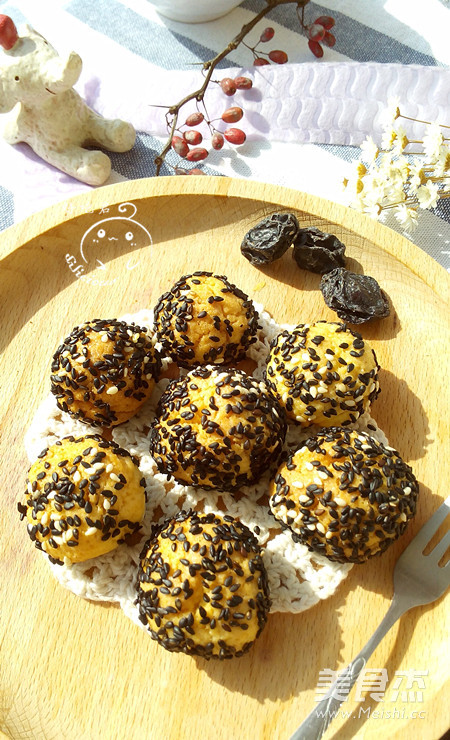 2.捏下来面团的一块儿,揉成圆球,大小和桂圆差不多。面团在清水中滚一圈,再放入芝麻中滚一下。(我的白芝麻快用完了,所以大部分都是黑芝麻)